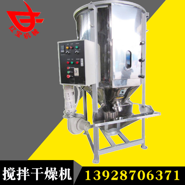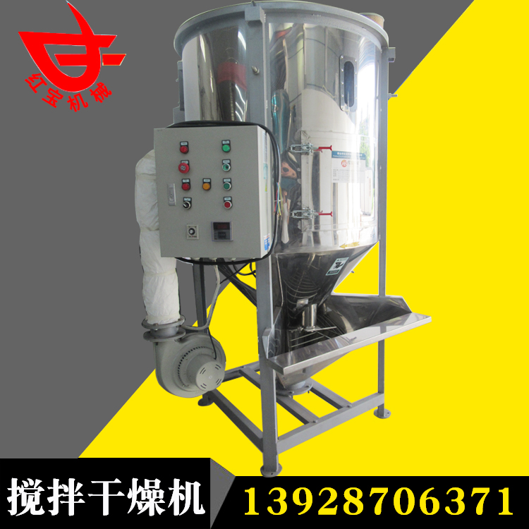 聚丙稀塑料顆粒大型熱風(fēng)干燥機(jī)主要用于多種顏色塑料顆粒的混合、干燥。是注塑機(jī).造粒機(jī)的必備配套設(shè)備之一,塑料粒子從進(jìn)料 斗進(jìn)入,在螺旋葉片推進(jìn)力的作用下,沿著葉片表面向上滑動前進(jìn),在上部的離心力作用下,向桶體四周拋開,散開的物料不斷向下移動,由循環(huán)出料口和桶內(nèi)循環(huán)料口不斷被螺旋葉片帶動提升,這樣反復(fù)循環(huán),達(dá)到混合的目的。與此同時空氣經(jīng)鼓風(fēng)機(jī)送至電加熱箱中,加熱后成為熱風(fēng)再經(jīng)溫控表自動控制,以均勻合適的熱風(fēng)從樹脂顆粒間一路穿透,穿過物料層,沿途進(jìn)行熱交換,不斷帶走濕氣,樹脂粒子由上而下徐徐下降過程中連續(xù)不斷得到吹掃干燥,完成高效率干燥和混合工藝。